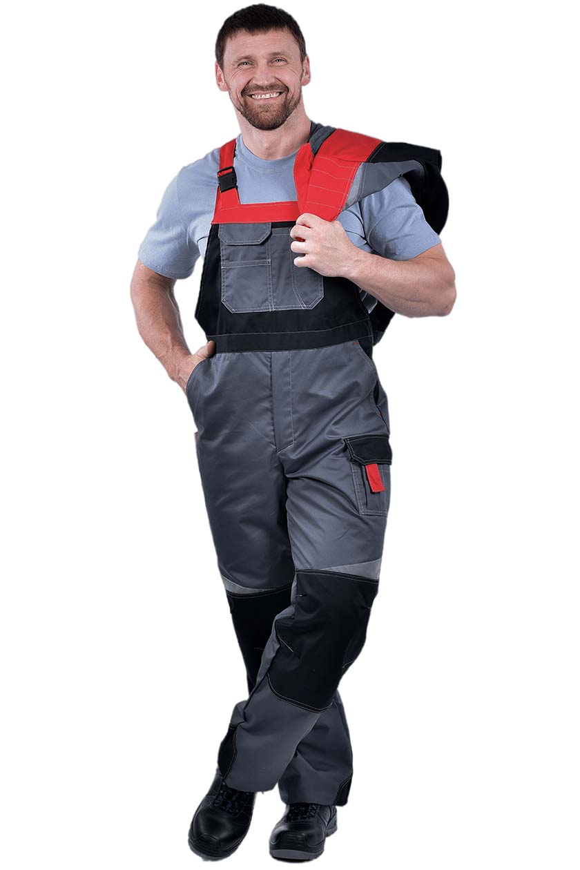 ➠ Полукомбинезон с застежкой на пуговицу в правом боковом шве. Застежка гульфик на «молнию». Колени усилены накладками, заложены по 2 вытачки. По шву наколенников косые, фигурные вставки СОП.